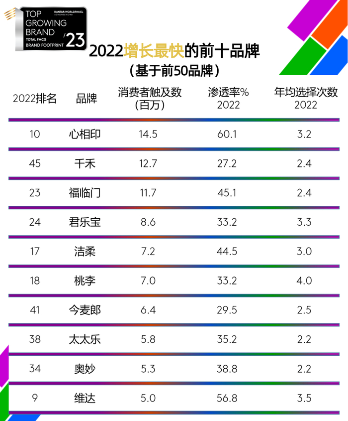 ● 与此同时,食品类品牌金龙鱼,与生活用纸品牌心相印进入前十榜单。其中,维达和心相印也同时进入2022年增长最快的前十品牌之列。