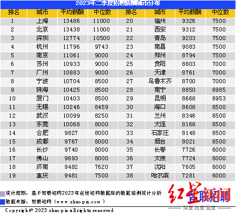 7月6日,红星新闻记者从智联招聘获悉,2023年第二季度,智联招聘继续发布《中国企业招聘薪酬报告》,展示国内38个核心城市企业的招聘薪酬水平。