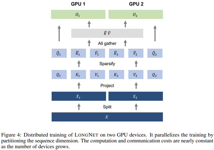 该研究利用 LONGNET 的线性计算复杂度来进行序列维度的分布式训练。下图 4 展示了在两个 GPU 上的分布式算法,还可以进一步扩展到任意数量的设备。