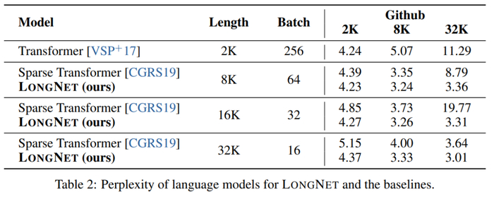 该研究将 LONGNET 与 vanilla Transformer 和稀疏 Transformer 进行了比较。架构之间的差异是注意力层,而其他层保持不变。研究人员将这些模型的序列长度从 2K 扩展到 32K,与此同时减小 batch 大小,以保证每个 batch 的 token 数量不变。