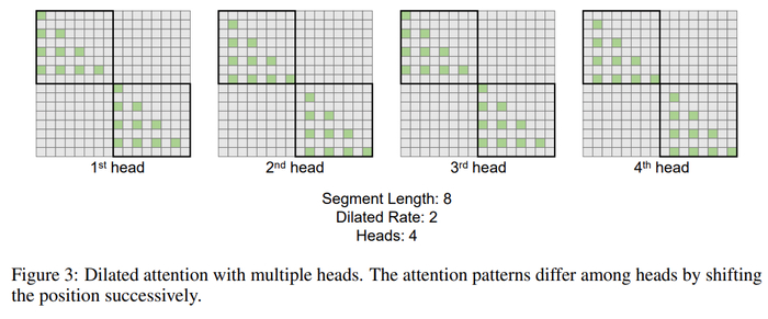 该研究进一步引入了多头 dilated attention 机制。如下图 3 所示,该研究通过对查询 - 键 - 值对的不同部分进行稀疏化,在不同的头之间进行不同的计算。