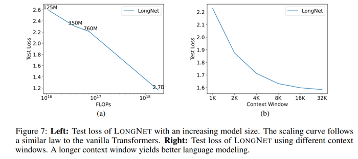 大型语言模型的一个重要属性是:损失随着计算量的增加呈幂律扩展。为了验证 LONGNET 是否仍然遵循类似的扩展规律,该研究用不同的模型规模(从 1.25 亿到 27 亿个参数) 训练了一系列模型。27 亿的模型是用 300B 的 token 训练的,而其余的模型则用到了大约 400B 的 token。图 7 (a) 绘制了 LONGNET 关于计算的扩展曲线。该研究在相同的测试集上计算了复杂度。这证明了 LONGNET 仍然可以遵循幂律。这也就意味着 dense Transformer 不是扩展语言模型的先决条件。此外,可扩展性和效率都是由 LONGNET 获得的。