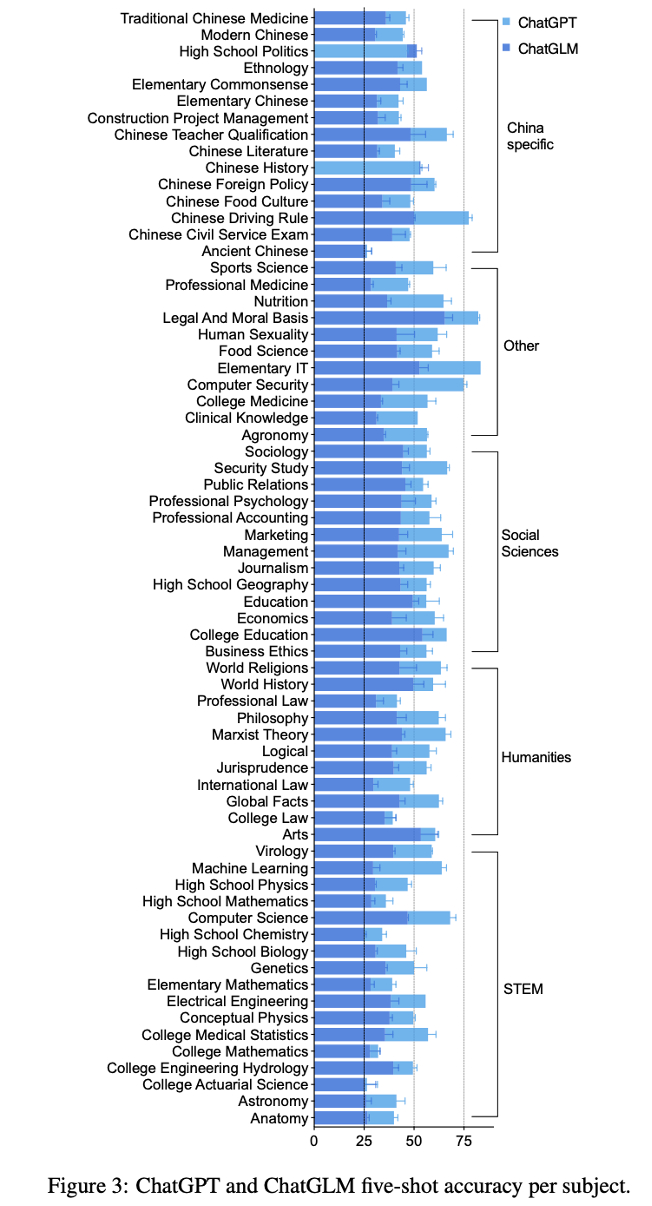 研究将中文模型 ChatGLM 与多语模型 ChatGPT 在每个学科上进行了比较,并对学科进行了分类,并在图 3 中呈现了结果。具体的数值结果请在论文中查阅。