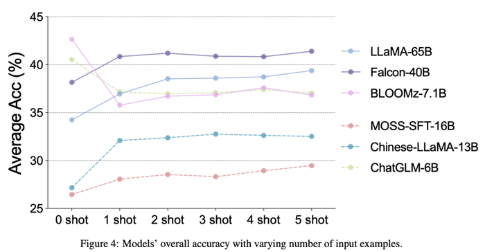 图 4 展示了使用不同模型在不同数量少样本示例的平均准确率。明显可以看出,当提供一些示例时,大多数模型的性能有所提高。尽管随着示例数量的增加可能会出现波动,但整体趋势显示出性能的提升。然而,对于 ChatGLM 和 BLOOMZ 模型,0-shot 设置的性能优于少样本设置。研究团队推测这是因为这些模型已经通过预训练或微调过程广泛利用了类似的问题和答案对,已经具备了全面理解问题的能力,不需要示例的支持 [3]。