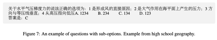 在各种中文考试中,有一种典型的问题类型称为 「子选项问题」。这些问题包括一个主要陈述和多个子选项,并询问子选项的数量、顺序或选择,需要模型具备更深层的推理和推断能力(见图 7 中的示例)。表格 4 显示了评估结果。