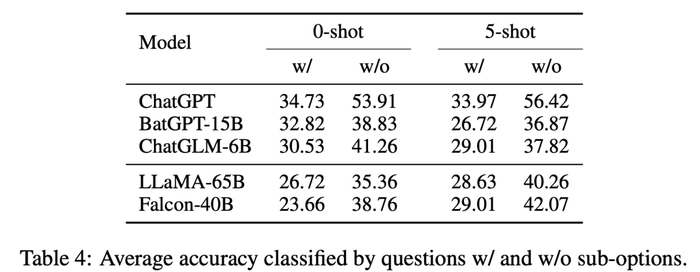 所有这些 LLM 在子选项问题上的表现较弱。ChatGPT 在子选项问题上的性能显著下降约 20%,而其他模型的下降范围在 5% 至 15% 之间。对比多语言模型和中文定向模型,子选项问题与其他问题之间的性能差距较大超过 10%,后者性能差距在 10% 以下。这也许是因为训练数据中的这种情况在中文语言中更为常见。