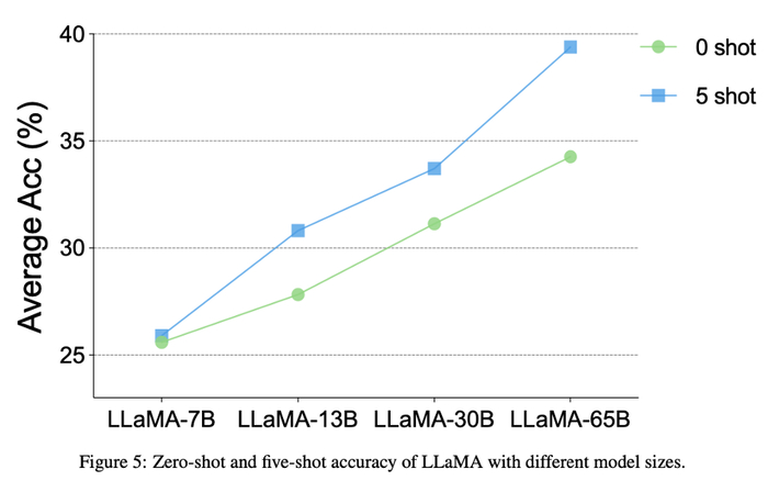 研究使用 LLaMA 系列模型的四个不同规模进行了考察:7B、13B(训练于 1.0T tokens)、30B、65B(训练于 1.4T tokens)。这些模型的 0-shot 和 5-shot 设置的整体准确率如图 5 所示。从结果中,研究团队观察到随着模型规模近似翻倍,准确率稳定增加约 5 个百分点。是否有可能拥有 500B 参数的 LLaMA 模型可以达到与 ChatGPT 相当的性能水平?而最近的研究表明,具有更少参数但使用高质量训练数据的模型可以达到与一些更大模型(Falcon-40B 对比 LLaMA-65B)相当甚至更好的结果 [1]。如何高效地进一步提升 LLM 的性能仍然是一个未解决的问题。