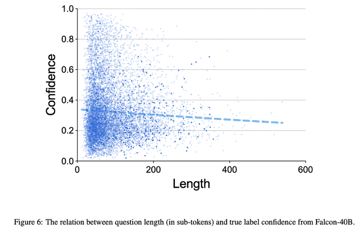 研究将模型的真实标签置信度(四个选项中的 softmax)视为问题难度的估计,并在图 6 中比较了 Falcon-40B 的问题难度与问题长度之间的关系。研究进行了回归分析,发现问题长度与真实标签置信度之间的相关性略微正相关。