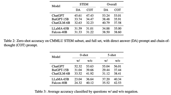 研究发现,对于没有进行微调的模型(LLaMA 和 Falcon),使用逐步思考的提示并没有 明显提高 STEM 和整体准确度。而对于进行了微调的模型(在表格 2 的第一部分),中文导向的模型(ChatGLM 和 BatGPT)的整体性能下降了约 3%,ChatGPT 的性能也略微下降了 0.2%。这些结果表明,逐步思考的提示确实有助于这些模型回答与 STEM 相关的问题。