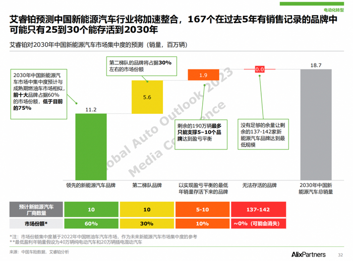 不过,从长远来看,许多电动汽车初创公司将会倒下。艾睿铂预测,中国新能源汽车市场将加剧整合——在过去 5 年有销售记录的 160 多个中国新能源品牌中,可能只有 25-30 家能存活到 2030 年。