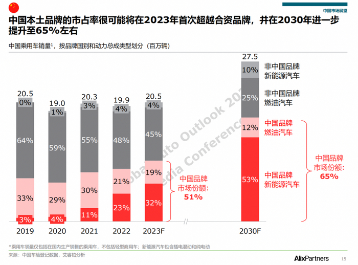 “中国车企在全球范围内的影响力来到了一个关键的‘拐点’,有望重新塑造全球汽车行业格局。”7月5日,艾睿铂(AlixPartners)大中华区联席负责人戴加辉(Dr. Stephen Dyer)在发布《2023全球汽车展望报告》(下称《报告》)时表示,“这是自改革开放以来,中国自主品牌在国内市场的销量首次超过海外品牌。预计到 2030 年,本土品牌在中国将占据 65%的市场份额。”