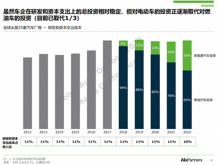 但不断增长的新能源销量会对传统车企在利润率及现金流上产生短期压力,阻碍他们对电动化转型的投入。目前,电动化相关投资已经占到主机厂年度研发和资本支出的三分之一以上,且比例还在持续提升。然而,还是只有少数电动汽车企业实现了盈利。