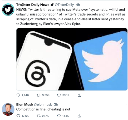 在昨天Threads上线之后,马斯克的私人律师斯皮罗(Alex Spiro)向扎克伯格发送制止函,指责Meta系统性、有意以及非法使用推特的商业机密和IP,以及搬用推特的数据。律师函提到Meta雇佣了推特的前员工吧,获取了推特的商业机密,威胁要对Meta提起诉讼。马斯克对此表态说,“竞争是可以的,但欺骗是不可接受的。”