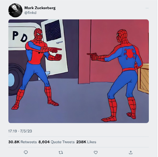 有趣的是,在Threads上线之后,扎克伯格还专门来到推特平台,11年以来首次发布内容,只发了一张《蜘蛛侠对阵蜘蛛侠》的漫画图片,或许是调侃回应关于Meta再次抄袭的说法。他上次发推特还是2012年1月。