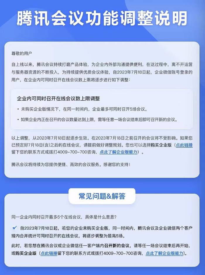 腾讯会议表示,以上调整从 2023 年 7 月 18 日起逐步生效,在 2023 年 7 月 18 日之前召开的会议将不受影响。