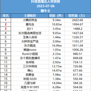7月6日,抖音直播达人带货榜一是小魏总珠宝,销售额2422.66万;榜二董先生,销售额1994.67万;榜三刘11,销售额1488.2万。