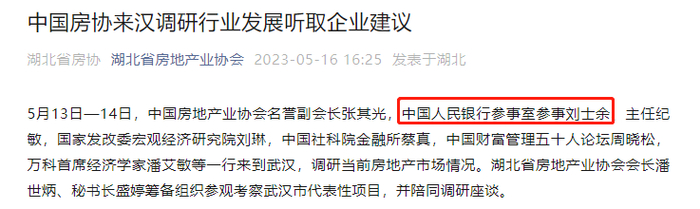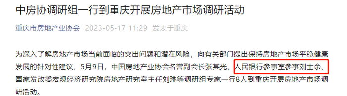 另据重庆市房地产业协会微信公众号5月17日、湖北省房地产业协会微信公众号5月16日发布的消息,包括人民银行参事室参事刘士余在内的调研组专家,到重庆、武汉调研当前房地产市场情况。