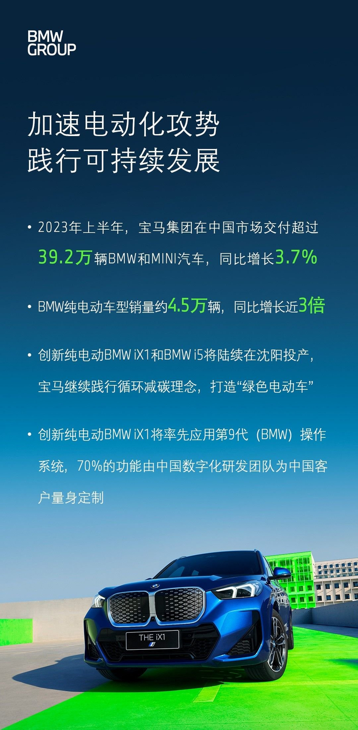 宝马中国发布了上半年销量成绩单,今年1-6月,宝马集团在中国市场交付超过39.2万辆BMW和MINI汽车,同比增长3.7%,其中BMW纯电动车型销量约4.5万辆,同比增长近3倍,月均7500辆,足够羡煞很多新势力了。