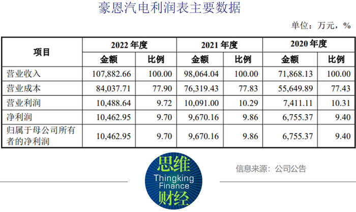 2020年-2023年第一季度,豪恩汽电的营业收入分别为7.19亿元、9.81亿元、10.79亿元。分别同比增长12.61%、36.45%、10.01%。