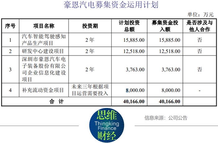 据招股书披露,豪恩汽电计划将所募集资金分别用于汽车智能驾驶感知产品生产项目、研发中心建设项目、深圳市豪恩汽车电子装备股份有限公司企业信息化建设项目、补充流动资金项目,分别计划投资1.59亿元、1.25亿元、3763.00万元、8000万元。