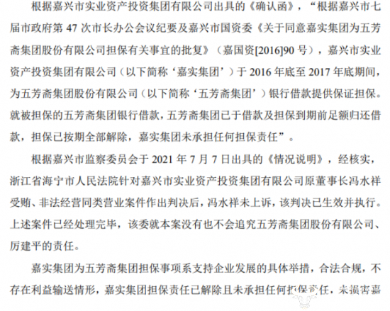 根据资料显示,嘉兴市实业资产投资集团有限公司的确在2016年底至2017年底期间,为五芳斋集团股份有限公司银行借款提供保证担保,但是五芳斋在借款和担保到期前就已经足额归还借款了,担保已经按期全部解除,所以两家公司的担保和被担保关系是合法合规,不存在利益输送的情形。