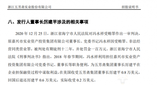据五芳斋招股书里说明,在2018年春节期间,原绍兴市实业资产投资集团有限公司董事长冯水祥,利用职务便利,为为五芳斋集团董事长厉建平在企业担保融资过程中谋取利益,在美国收受五芳斋集团董事长厉建平0.8万美元,回国后退还厉建平0.6万美元,实际收受0.2万美元。