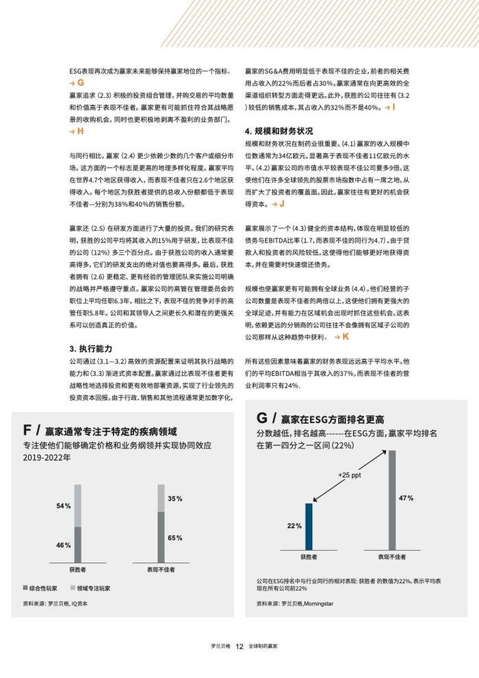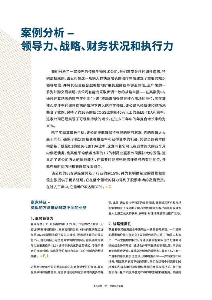 获胜者在其投资组合中表现出一致的战略原理。一个清晰的愿景和价值主张定义了公司所代表的内涵,并给员工和客户一个与之接触的目的。专注使赢家能够实现(2.1)清晰可辨的组合协同效应,通过合并不同品牌的销售队伍,同步的商业和医疗活动,或共享控制和治理结构。赢家通常(2.2)有一个清晰的愿景和价值主张,其中包括ESG——并转化为ESG得分,明显优于表现不佳的同行。鉴于监管机构、客户和投资者对ESG的审查越来越重要,卓越的ESG表现再次成为赢家未来能够保持赢家地位的一个指标。