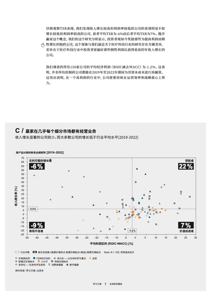 我们针对对个体公司为股东创造价值的方式的分析识别出了制药业内的巨大差异。一组排名靠前的,我们称之为“赢家"的公司在2019年至2022年期间,每年的平均TSR为22%。而排名最低的一组,即后四分之一的“表现不佳者"在同一时期产生的平均年回报率为9%。