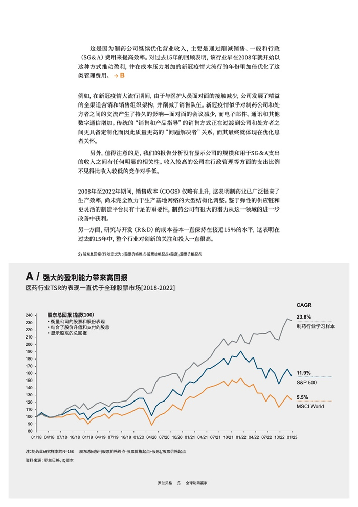 医药行业历来上享有比其他行业更高的利润率,这已转化为高于平均水平的TSR。我们的分析表明,最大的150家上市公司在2018—2022年实现了135%的平均TSR,轻松地超过了全球股市的表现(标准普尔500指数和MSCI世界股市指数的TSR分别为57%和24%)。