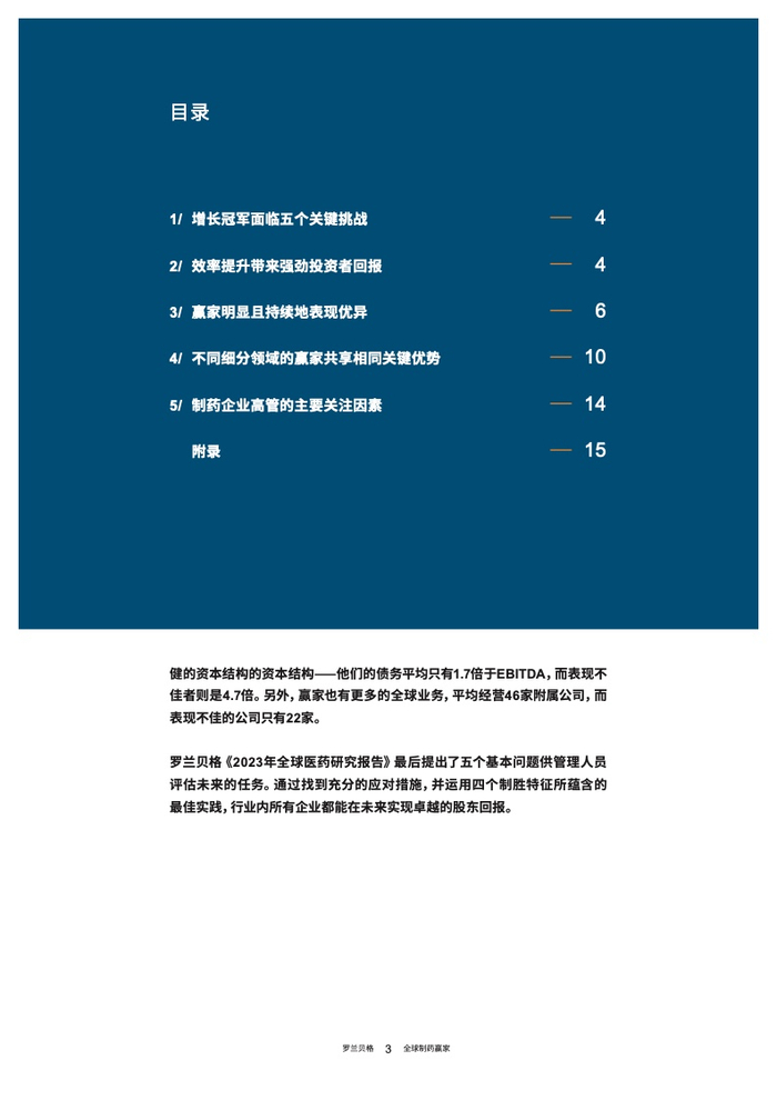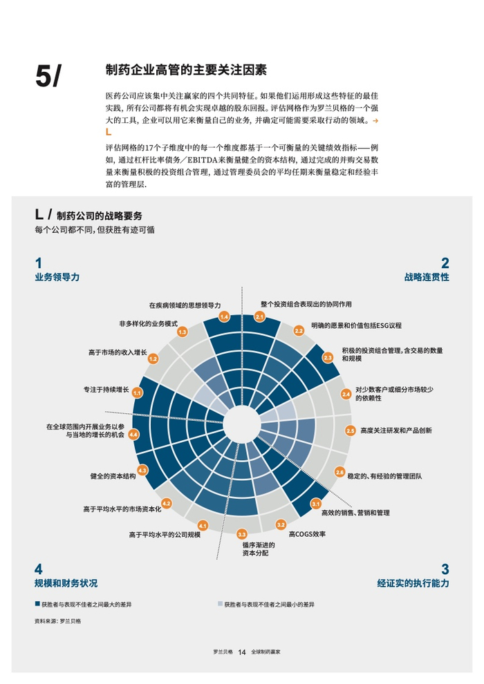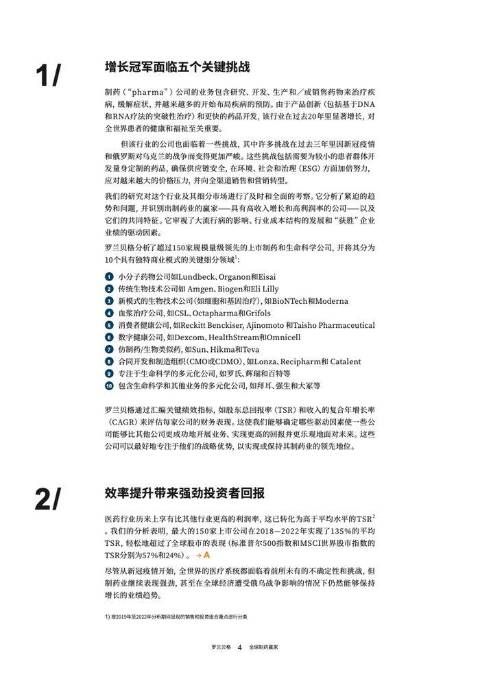 罗兰贝格通过汇编关键绩效指标,如股东总回报率(TSR)和收入的复合年增长率(CAGR)来评估每家公司的财务表现。这使我们能够确定哪些驱动因素使一些公司能够比其他公司更成功地开展业务、实现更高的回报并更乐观地面对未来。这些公司可以最好地专注于他们的战略优势,以实现或保持其制药业的领先地位。