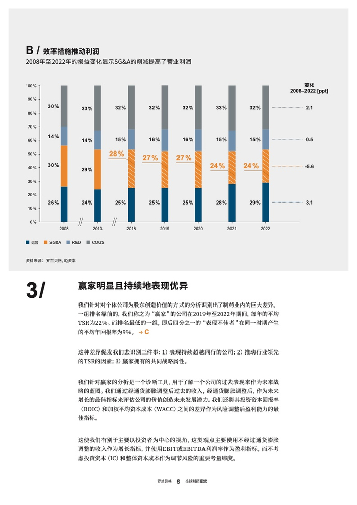2008年至2022年期间,销售成本(COGS)仅略有上升,这表明制药业已广泛提高了生产效率,尚未完全致力于生产基地网络的大型结构化调整。鉴于弹性的供应链和更灵活的制造平台具有十足的重要性,制药公司有很大的潜力从这一领域的进一步改善中获利。