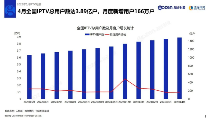 4月全国IPTV总用户数达3.89亿户,月度新增用户166万户。