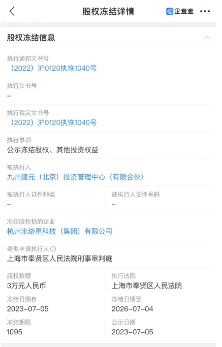 知名娱乐明星、投资大佬任泉爆出大瓜!近日,九州建元(北京)投资管理中心(有限合伙)新增一则股权冻结信息,冻结股权标的企业为杭州米络星科技(集团)有限公司,股权数额为3万元人民币,上海市奉贤区人民法院为执行法院。