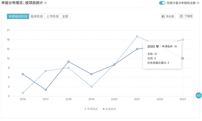 特别是今年,截至目前已经申报了18款药物,比去年全年的都要多。而在成分类别方面,多肽类药物仍然占大多数。