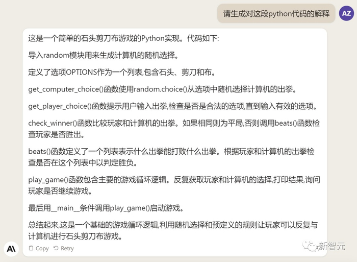 Claude 2给出了简洁明晰的解释:这是一个基础的剪刀石头布游戏循环逻辑。