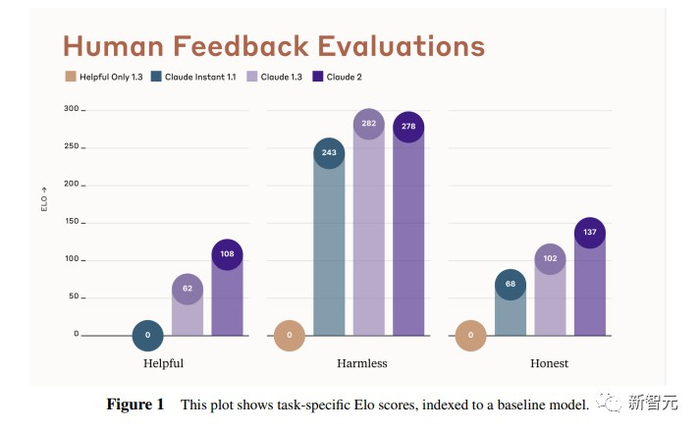 这个图对比了人工反馈(橙色)和Claude的方法在帮助性,诚实性和无害性评估中的得分。