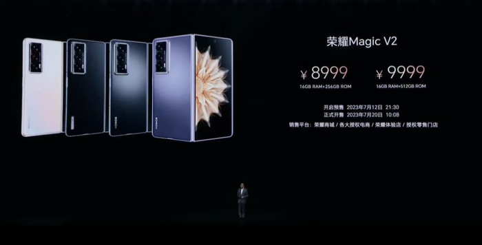 荣耀Magic V2提供雅黑色、绒黑色、绒紫色、云霞金四种配色,并有雅黑色至臻版,内预置手写笔。荣耀Magic V2提供16GB+256GB和16GB+512GB两个版本,售价分别为8999元和9999元;16GB+1TB荣耀Magic V2至臻版售价11999元。该系列手机在7月12日21:30开启预售,7月20日10:08起在荣耀商城、各大授权电商平台、荣耀体验店、授权零售门店正式开售。