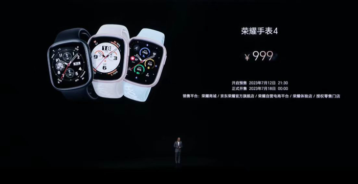 外观上,荣耀手表4采用1.75英寸AMOLED方形屏幕采用圆形边角设计,视觉效果圆润流畅;中框采用铝合金打造,搭配清爽透气的硅胶表带,提供曜石黑、晨辉金、云水蓝三款配色;首发即提供400种以上个性鲜明的表盘设计,满足用户不同的风格需求。荣耀手表4于2023年7月12日21:30开启预售,并将在2023年7月18日0点在荣耀商城、各大授权平台、荣耀体验店、授权零售门店正式开售,售价999元,授权电商平台预订立享50元优惠。