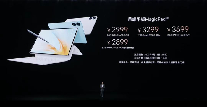 荣耀平板MagicPad 13共推出8GB RAM + 256GB ROM、12GB RAM + 256GB ROM、16GB RAM + 512GB ROM三个版本,预售价2899元起。7月12日21:30开启预售,7月20日10:08正式开售。