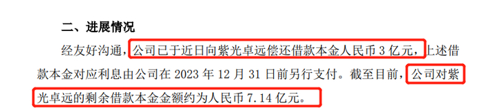 至今年7月,芯鑫保理的本金利息全部偿还完毕。随着近日向紫光卓远偿还借款本金3亿元,对紫光卓远的剩余借款本金金额也仅剩7.14亿元,学大的还债之路终于看到了曙光。