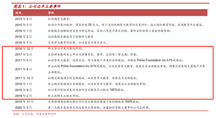 第二步,银润投资以19.13元/股的价格定增55亿元,其中23亿元用于收购学大教育。但这一步出现了意外,2015年资本市场剧烈震荡,定向增发遭遇挫折。2016年12月9日,定增方案终止。