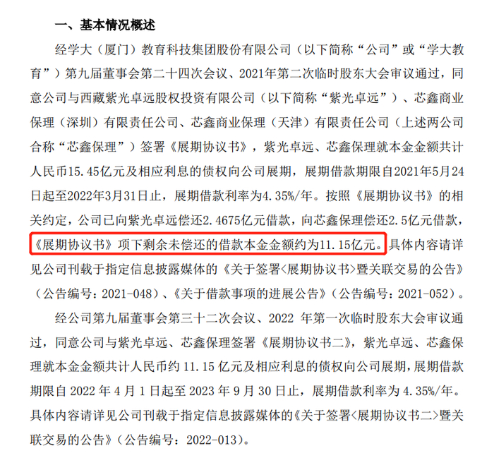 月初,学大教育刚刚还完对芯鑫保理的1.01亿借款。7月10日,学大向紫光卓远偿还借款本金3亿元,目前,剩余借款本金金额约为7.14亿元。