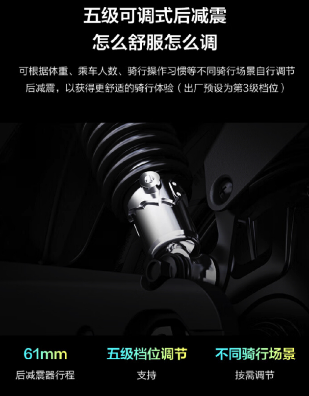 在乘坐系统测试中,九号远航家M95c也加入了五级可调式后减震,提供了61mm的行程和五级档位调节,乘车人员可以根据体重、乘车人数和骑行操作习惯等不同骑行场景自行调节后减震,以获得更舒适的骑行体验。尽管这项配置不会给驾驶者带来特别直观的感受,但对于一些追求极限性能的消费者来说,这仍然是必不可少的配置。