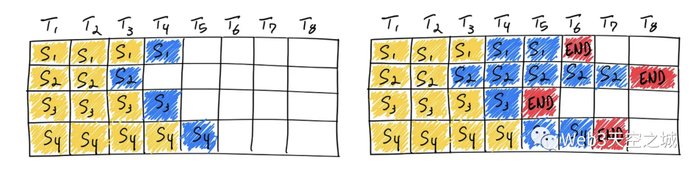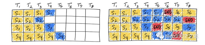 使用静态批处理完成四个序列。在第一次迭代(左边),每个序列从提示令牌(黄色)生成一个令牌(蓝色)。经过几次迭代(右边),完成的序列因为在不同的迭代中发出了它们的序列结束令牌(红色),所以它们的大小各不相同。尽管序列3在两次迭代后完成,但静态批处理意味着GPU在批处理中的最后一个序列完成之前处于未充分利用的状态(在这个例子中是序列2在六次迭代后完成)。