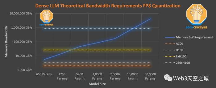 根据数学计算,一个拥有万亿参数的密集模型在最新的Nvidia H100 GPU服务器上也无法实现这样的吞吐量,因为它需要更大的内存带宽。每生成一个标记,都需要将每个参数从内存加载到芯片中。然后将生成的标记输入到提示信息中,生成下一个标记。此外,用于注意机制的KV缓存也需要额外的带宽进行流式传输。