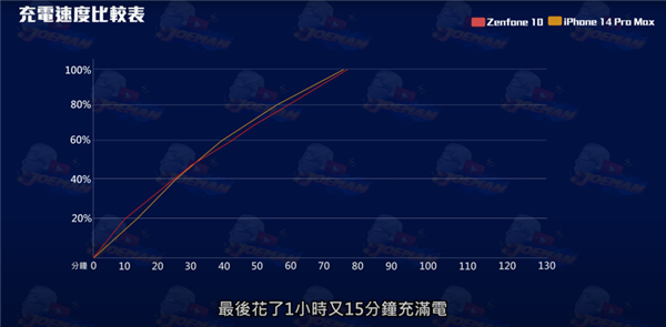 (充电速度:华硕Zenfone 10 VS iPhone 14 Pro Max,图源油管@Joeman)