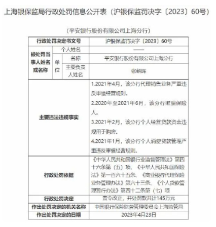 值得一提的是,今年4月23日,平安银行上海分行因”代理销售业务严重违反审慎经营规则、欺骗保险人、个人经营贷款资金违规用于购房、个人消费贷款管理严重违反审慎经营规则“等四项违规行为被上海银保监局责令改正并处罚款145万元。同时,相关责任人吴桢、刘青蓝均被给予警告并处罚款5万元。