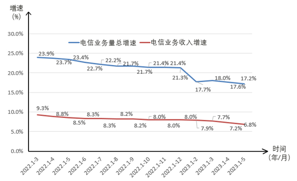 近年来我国电信业务总量和电信业务收入增速变化情况如图1所示。自2022年一季度以来,我国电信业务收入增长率步入下行通道,增速呈现小幅下降态势;电信业务总量也略有下降,增速由2022年1—3月的23.9%逐步下降到2023年1—5月的17.2%。