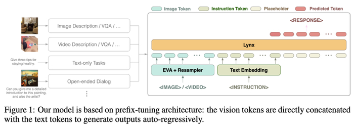 作者提出了 Lynx(猞猁)—— 进行了两阶段训练的 prefix-finetuning 的 GPT4-style 模型。在第一阶段,使用大约 120M 图像 - 文本对来对齐视觉和语言嵌入 (embeddings) ;在第二阶段,使用 20 个图像或视频的多模态任务以及自然语言处理 (NLP) 数据来调整模型的指令遵循能力。
