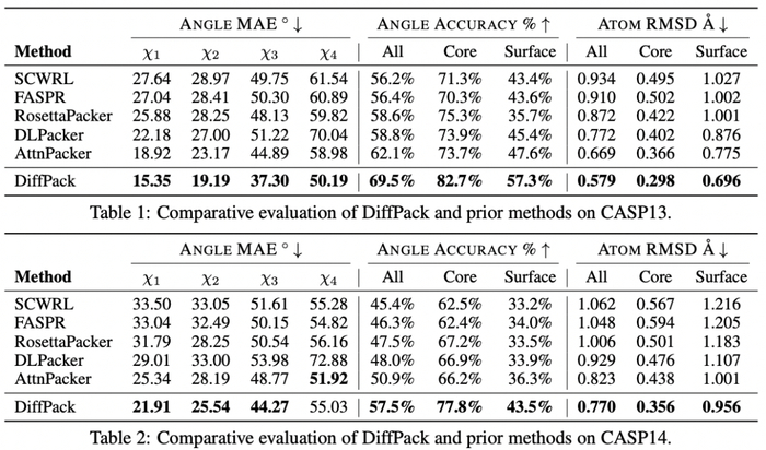 研究人员在包括天然主链结构和由 AlphaFold2 预测得到的非天然主链结构上进行了实验。DiffPack 在预测蛋白质侧链构象中超越了基于传统能量函数的方法和其他端对端的深度学习模型。表 1 总结了在 CASP13 中的实验结果,DiffPack 无论是在内部残基(82.7%)和表面残基(57.3%)上,都表现出了最高的角度精度。对于表面残基,其精度比之前的最先进模型 AttnPacker 提高了 20.4%。